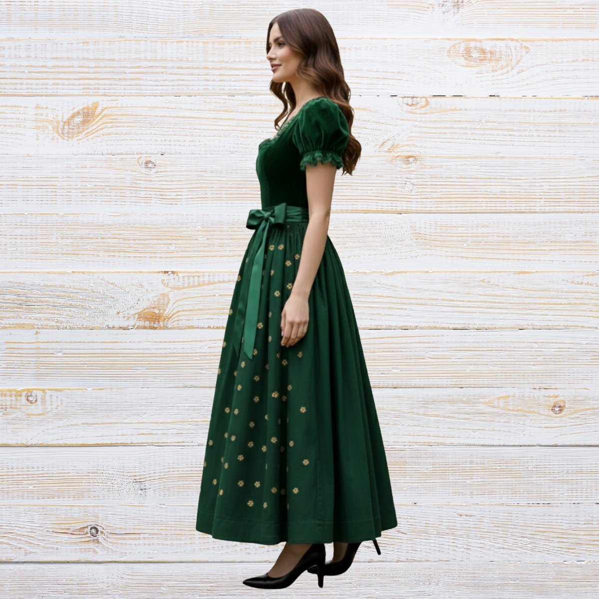 If you are looking for a classic green dirndl dress that stands out at Oktoberfest while staying true to Bavarian roots, this piece is the perfect choice.