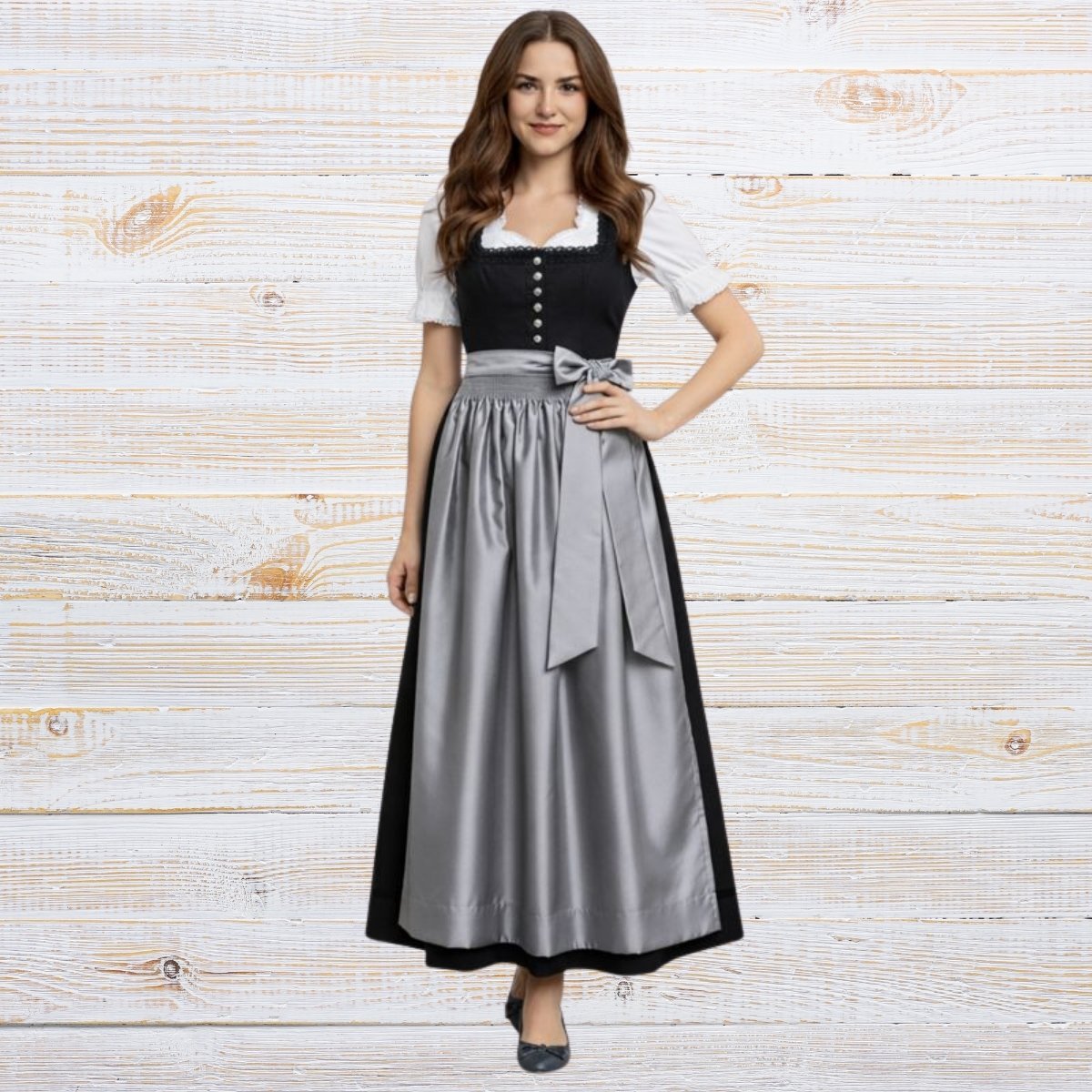 This elegant 3pcs set includes the black cotton dirndl dress, a smooth gray satin silk apron, and a white cotton blouse. Every piece works together to create a timeless look that feels comfortable, flattering, and easy to wear.
