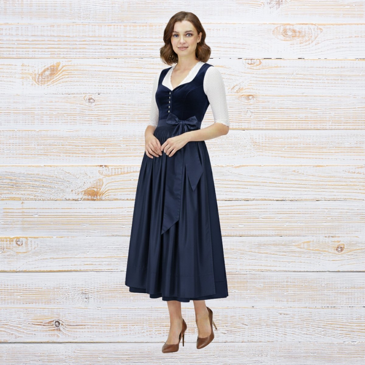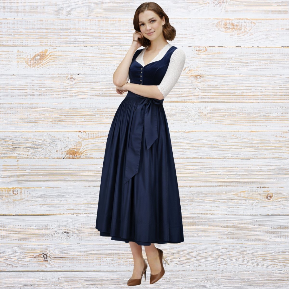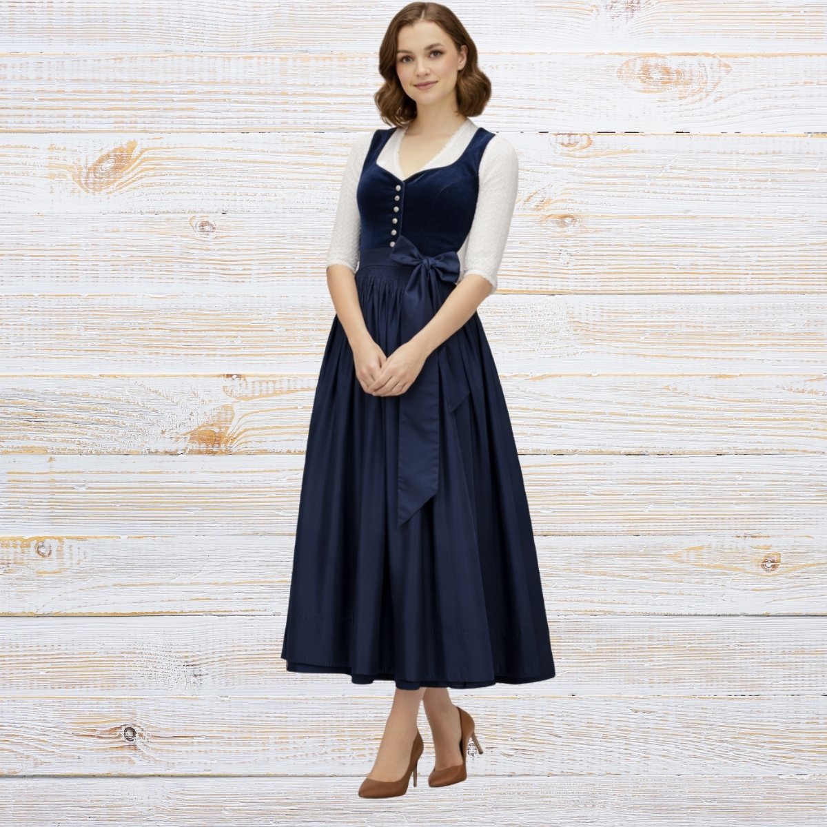It feels softer than black but just as powerful. It works beautifully for daytime festivals and evening events. This velvet dirndl for Oktoberfest uses matching navy tones across the bodice, skirt, and apron for a coordinated look that feels polished and refined.
